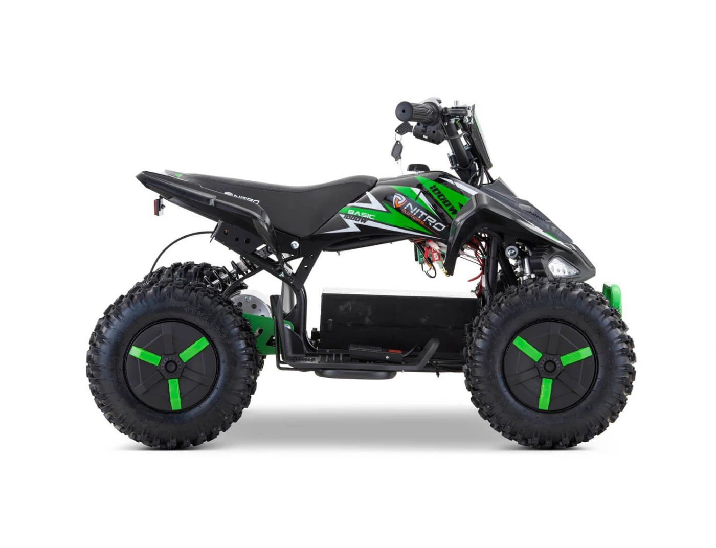 The ECO Python is equipped with 1000W electric motor and 3 x 12 V (36 V, 12 A) batteries, forward and reverse gear, battery level gauge and an additional security- foot switch (the quad only runs when the rider sits on it). With a maximum range of about 20 km and with the built-in 3 steps speed regulator (6 km/h, 18 km/h and 25 km/h) ECO Python offers the best quality for a reasonable price. The Environmentally friendly ECO Python Mini Quad is a very quiet electric drive and requires 90% less maintenance than the petrol variant.